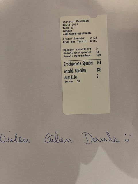 Gut besucht war die Blutspende am 13.11.25 in der Altenbürghalle Karlsdorf-Neuthard. Wir konnte 141 Spender begrüßen, von denen erfreulicherweise 11 Erstspender waren...